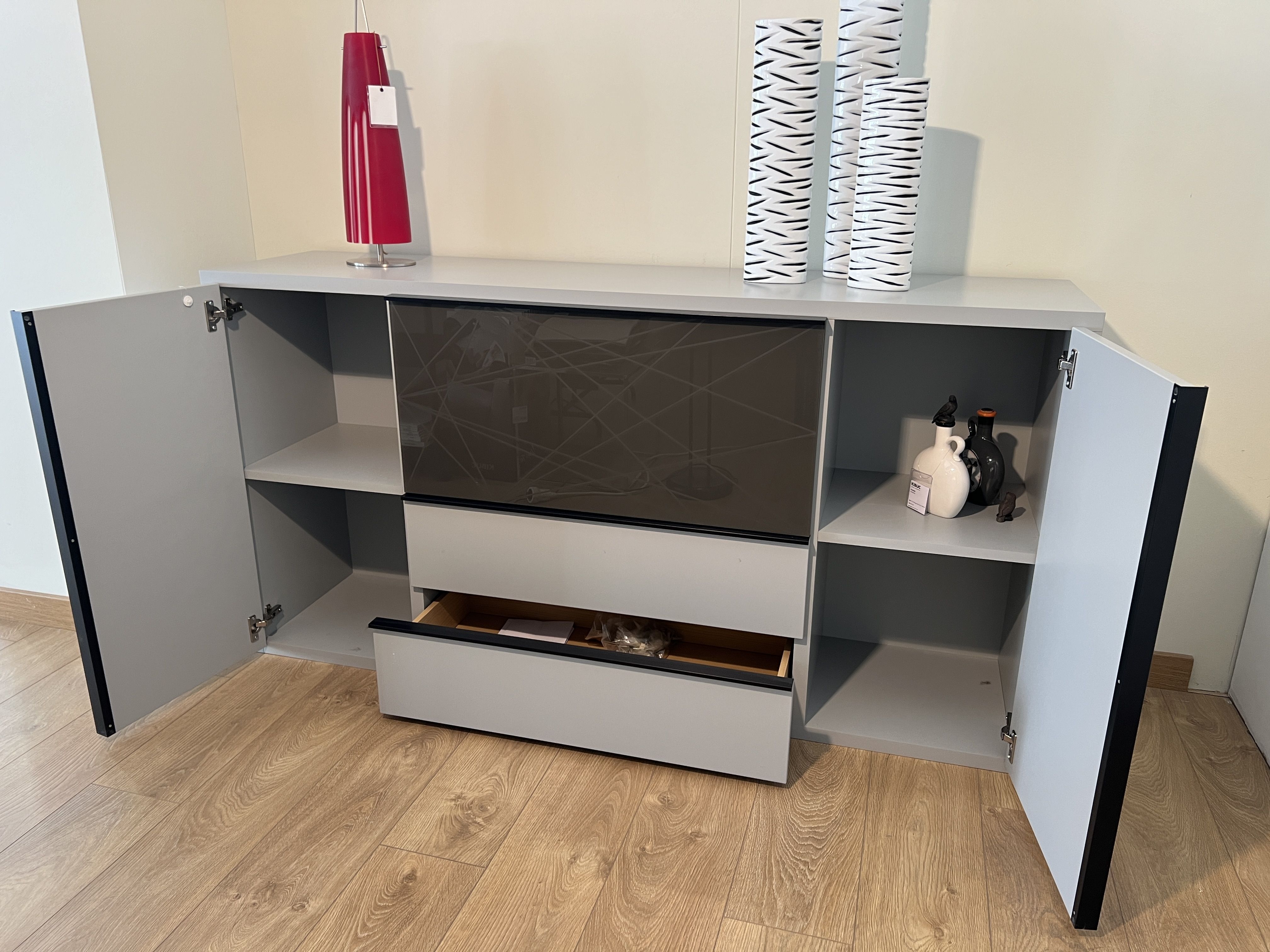 Aparador compuesto por dos puertas laterales, una puerta batiente y dos cajones en laca lluvia y cristal serigrafiado piedra.