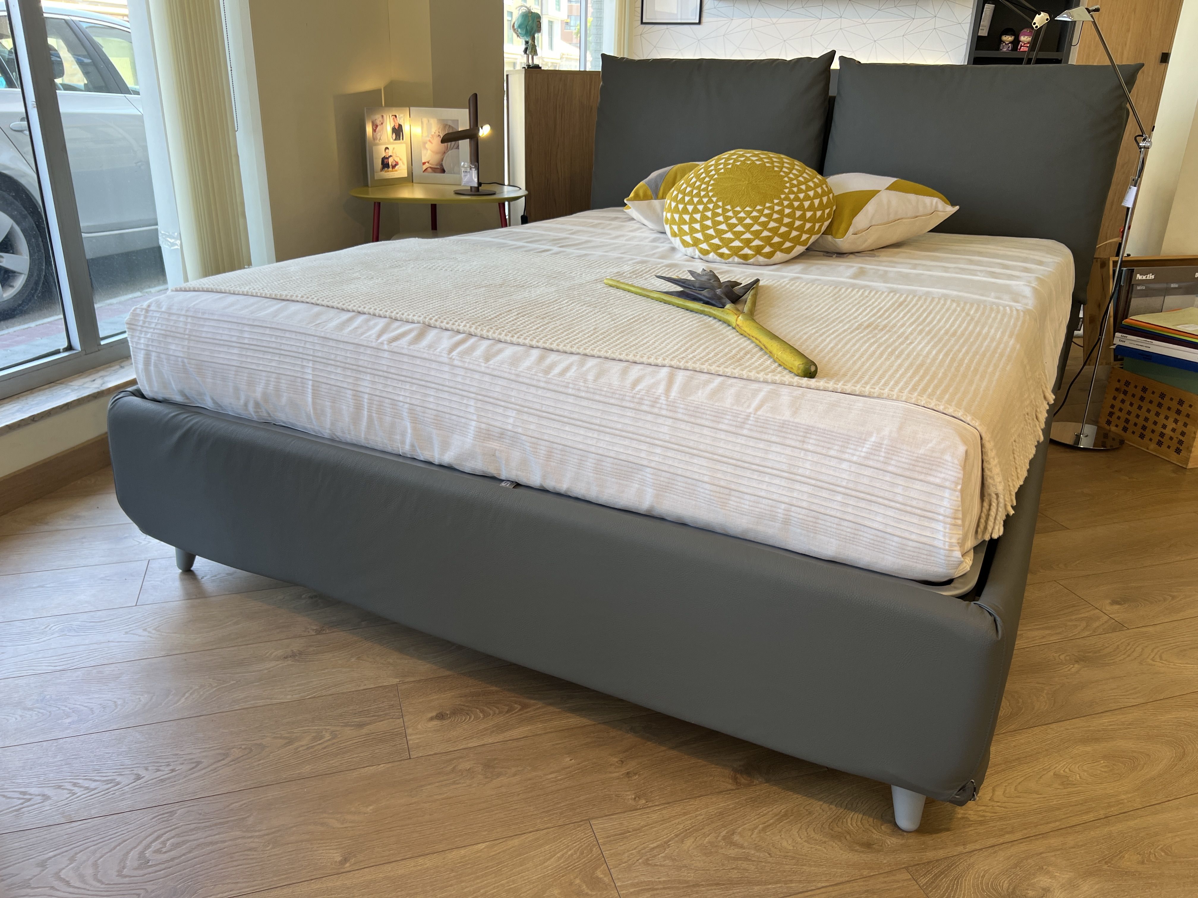 Cama tapizada en gris grafito con abatible y cabecero movil sobre patas en color aluminio.
