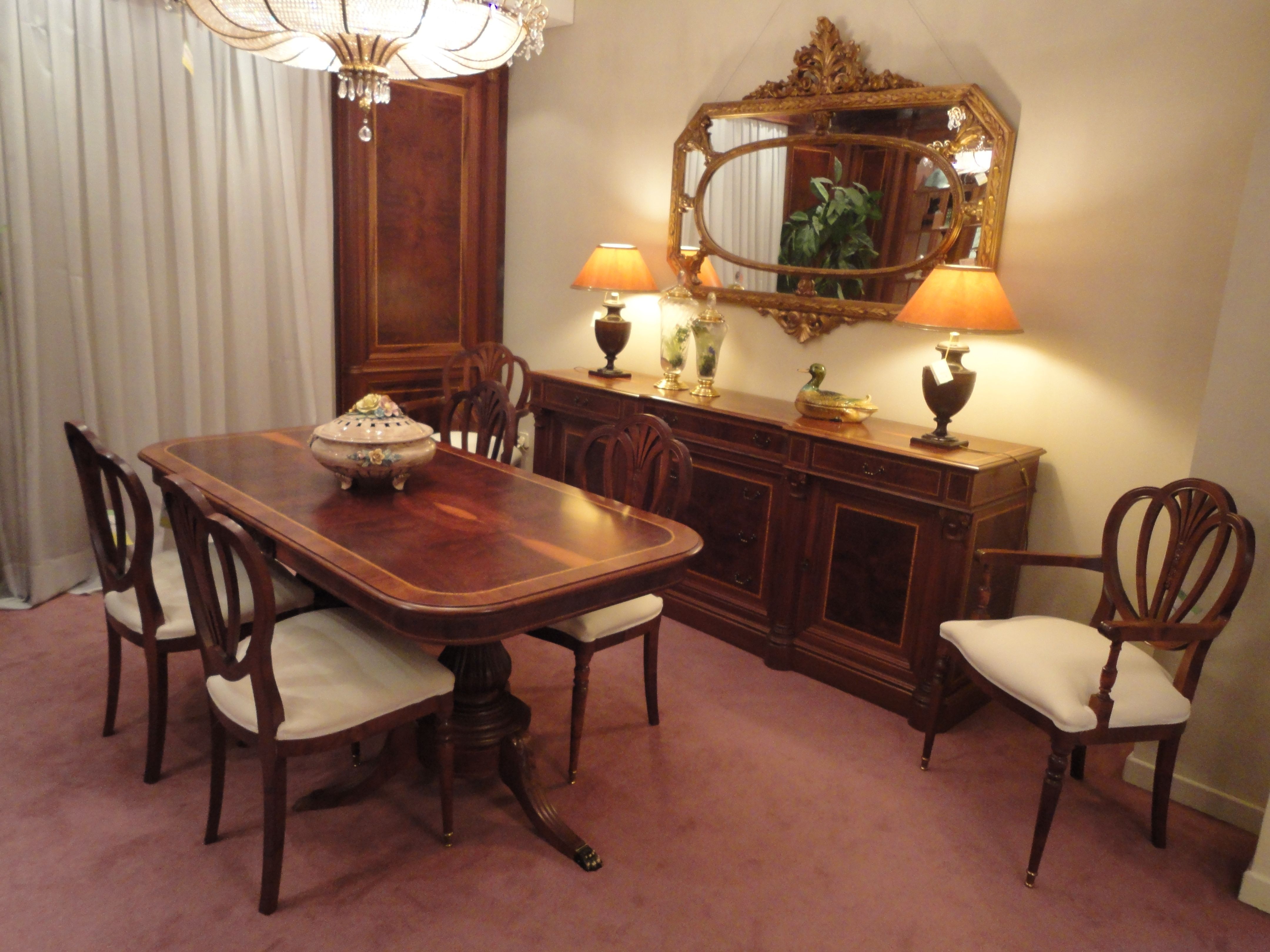 Comedor compuesto por aparador, mesa, 4 sillas y 2 sillones en acabado cerezo y nogal.