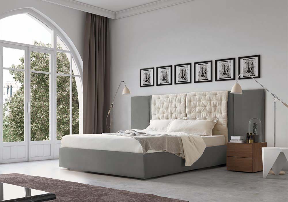Dormitorio cama cabecero corrido mesitas, tapizado chapa nogal
