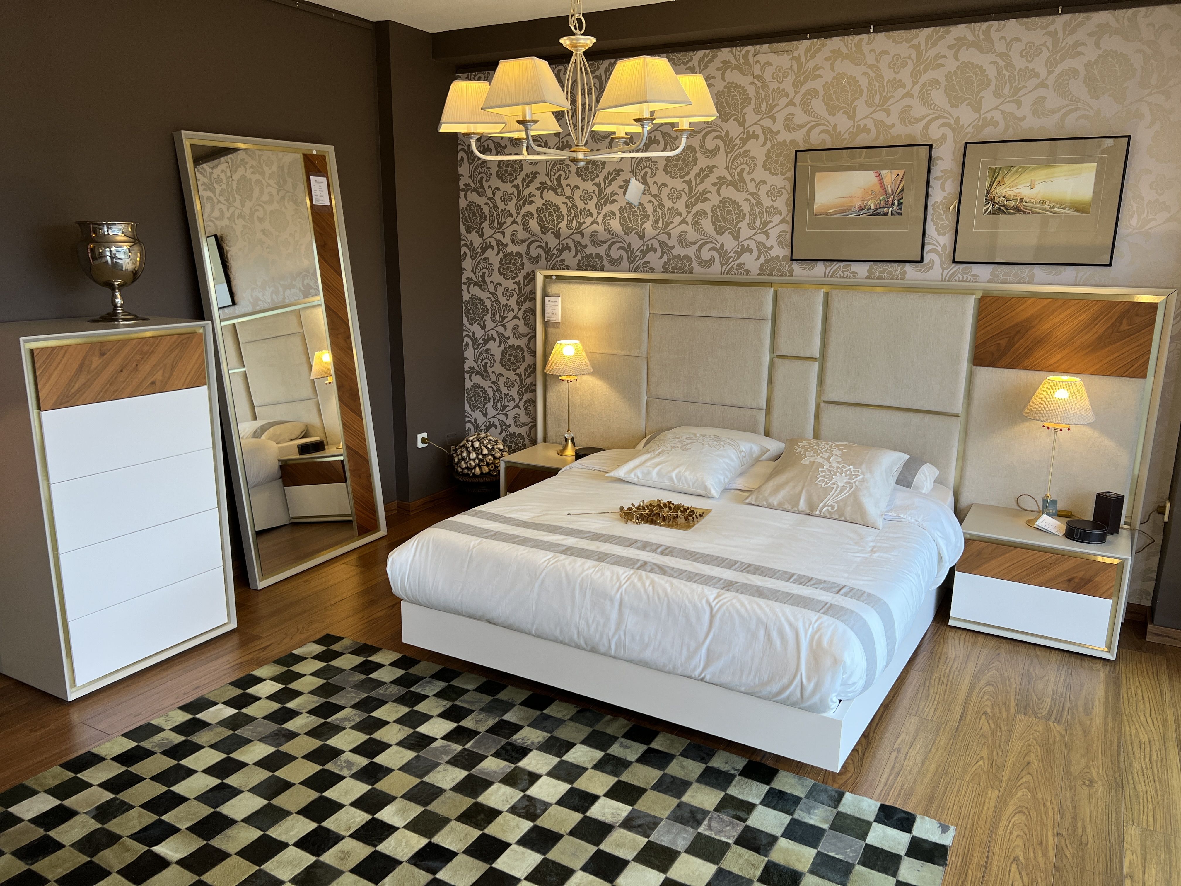 Dormitorio dorados compuesto por cabecero corrido y bancada , dos mesitas , chinfonier y espejo. Acabado nogal, laca y beige elite. Cabecero corrido + bancada (298x6x140h), Mesita (60x44x42h), chinfonier (70x49x126h), espejo (85x5,5x200h) Proveeedor 464