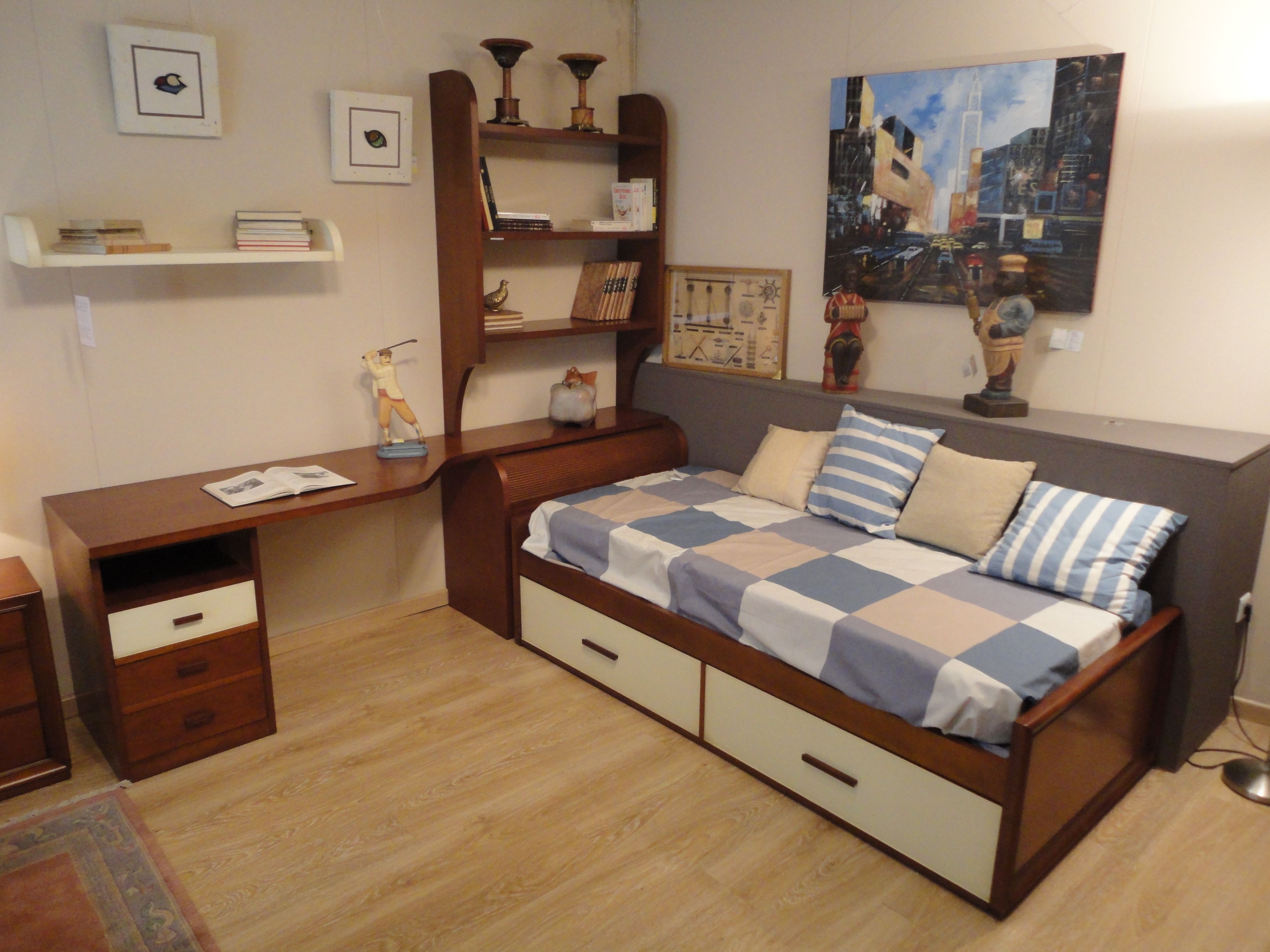 Dormitorio juvenil en acabado cerezo compuesto por cabecero, cama nido y mesa.