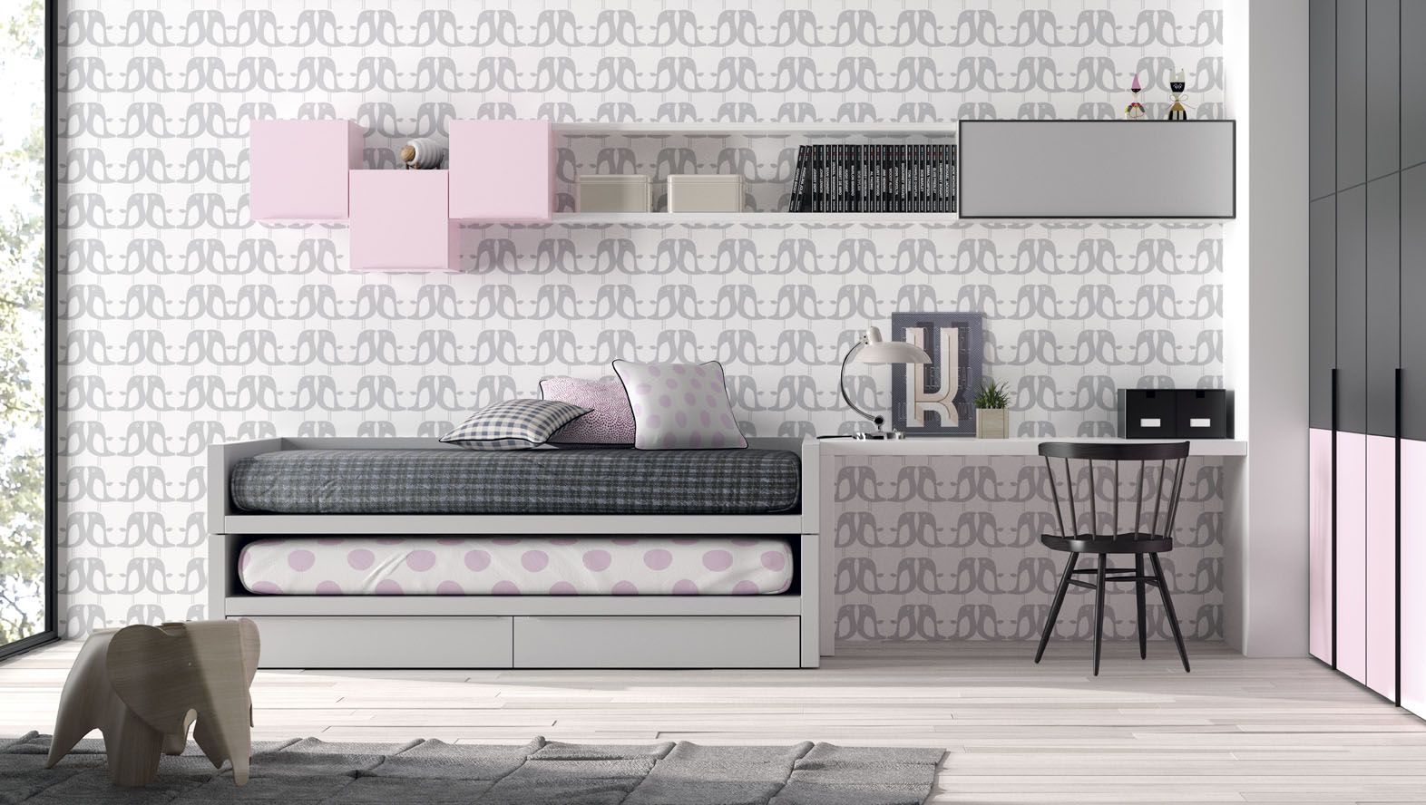 Dormitorio cama, mesa de estudio y armario, laminado sintético