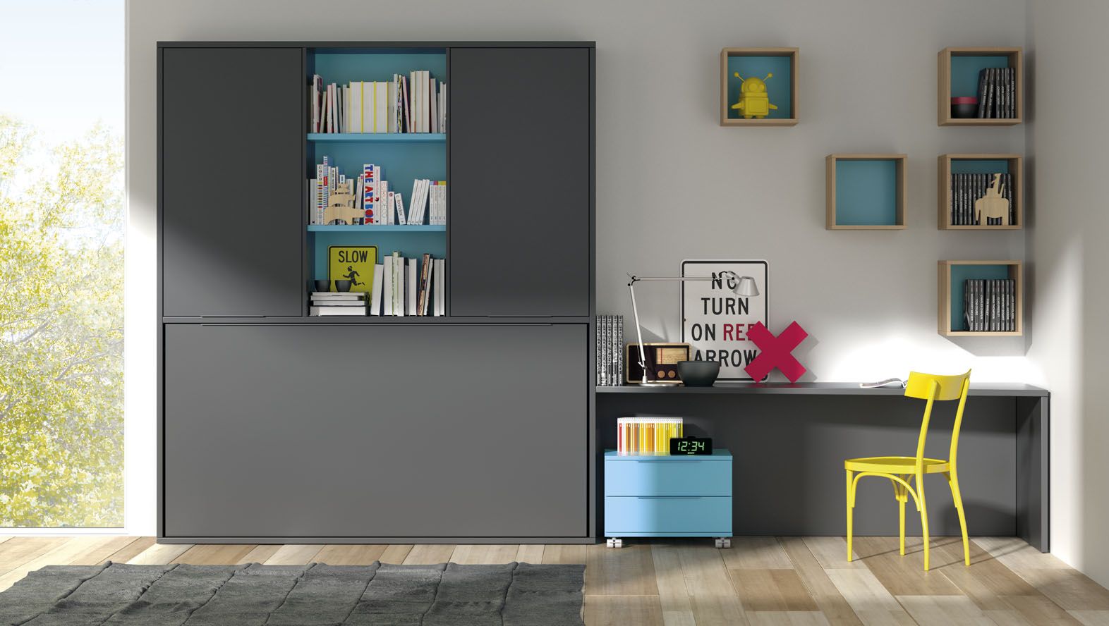 Dormitorio cama abatible y mesa de estudio, laminado sintético