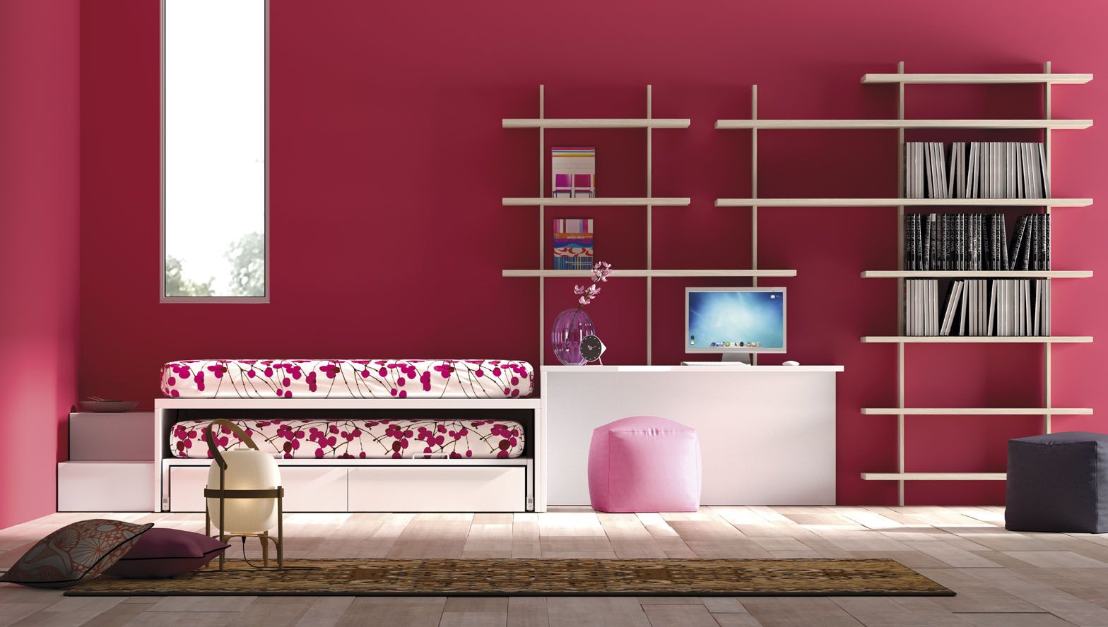 Dormitorio cama, mesa de estudio y librería, laminado sintético