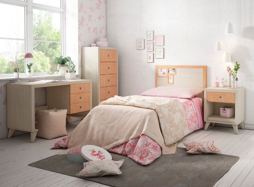 Dormitorio juvenil en madera de pino, haya y chapas naturales de maderas. Disponible en varios modelos de cabeceros, asi como en diferentes medidas. Acabados a elegir dentro de una amplia gama de posibilidades. Compuesto por:
