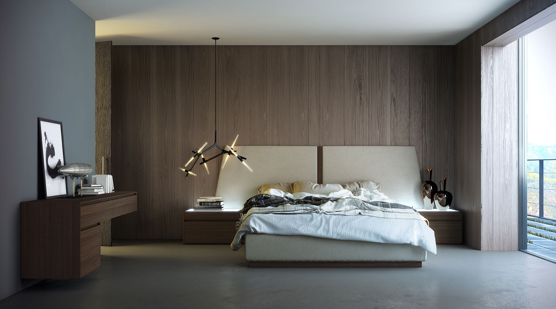 Dormitorio cama y mesitas, chapado eucalipto y tapizado