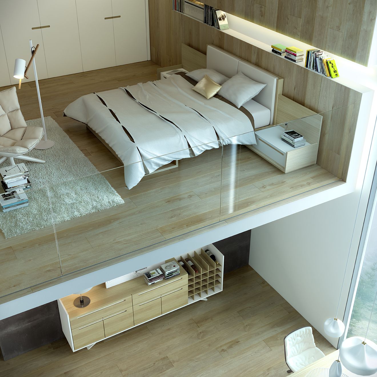 Dormitorio cama, cabecero corrido y mesitas, roble, lacado mate y tapizado