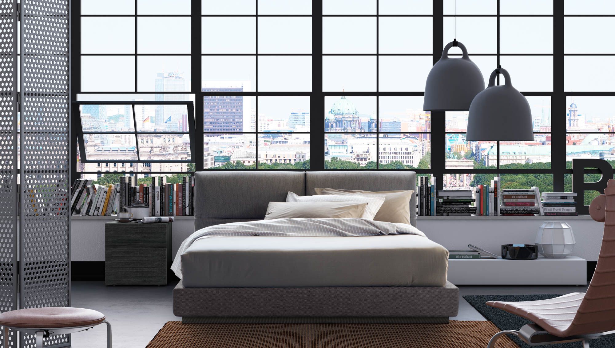Dormitorio cama mesitas, chapa roble gris tapizado laca mate