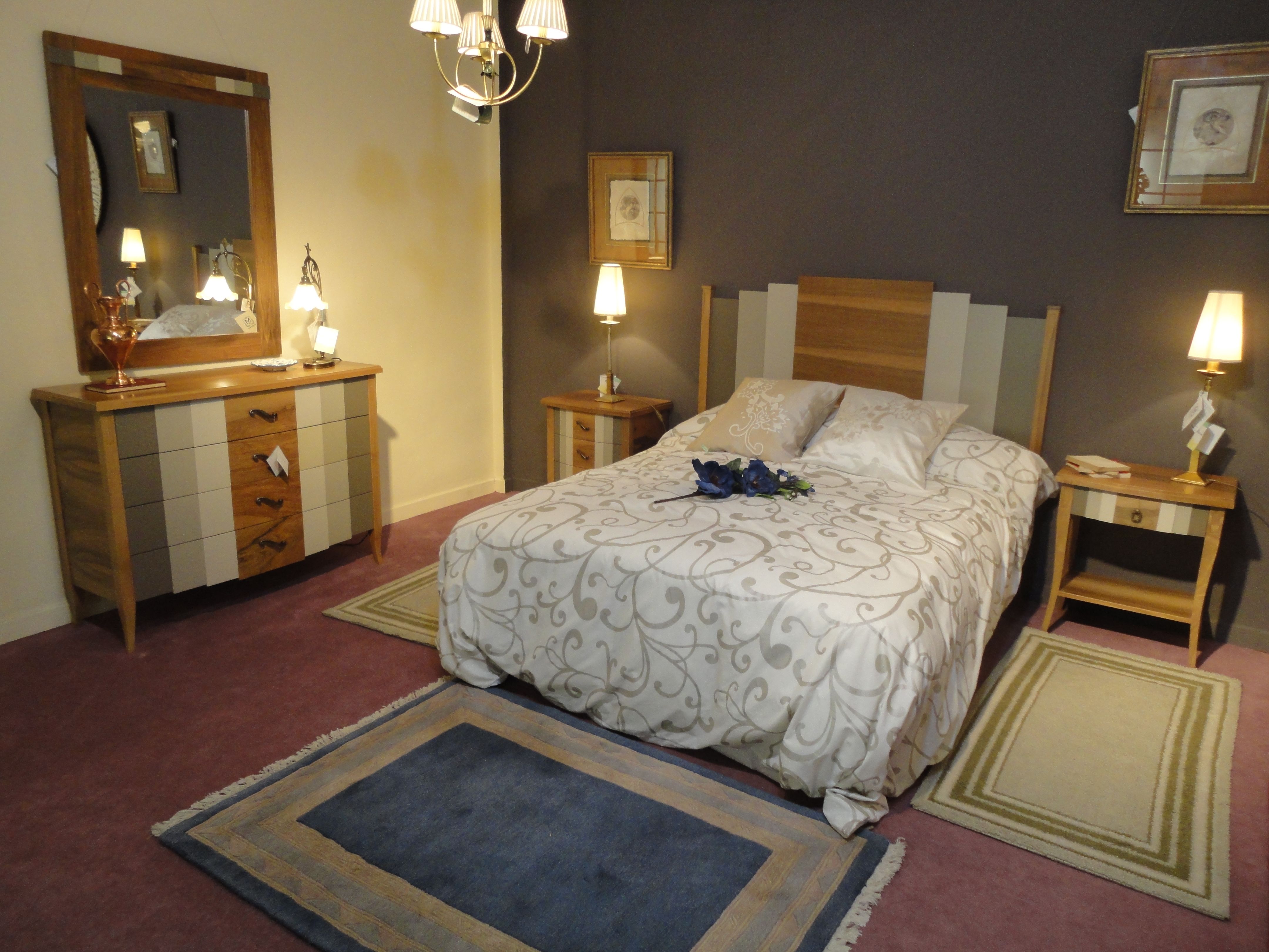 Dormitorio compuesto por cabecero, cómoda, mesita de 3 cajones y mesita de 1 cajón en acabado nogal y lacado.