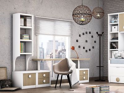 Dormitorio Juvenil ( zona de estudio) en laca Blanca y frentes en Roble, compuesto por: