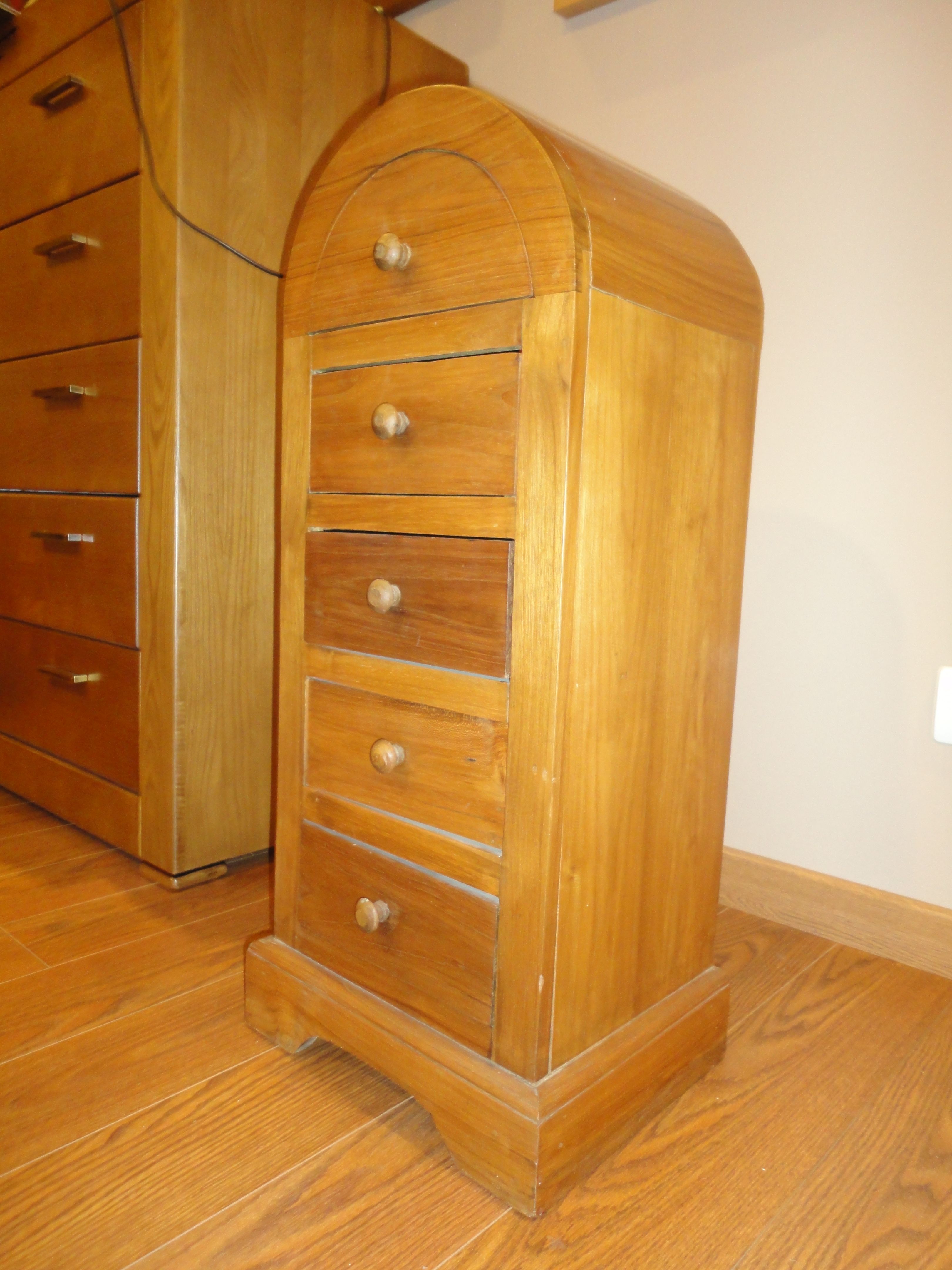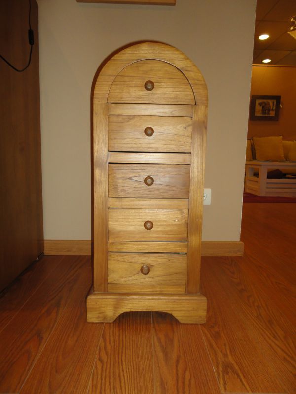 Mesita auxiliar de cinco cajones curva en acabado teka.