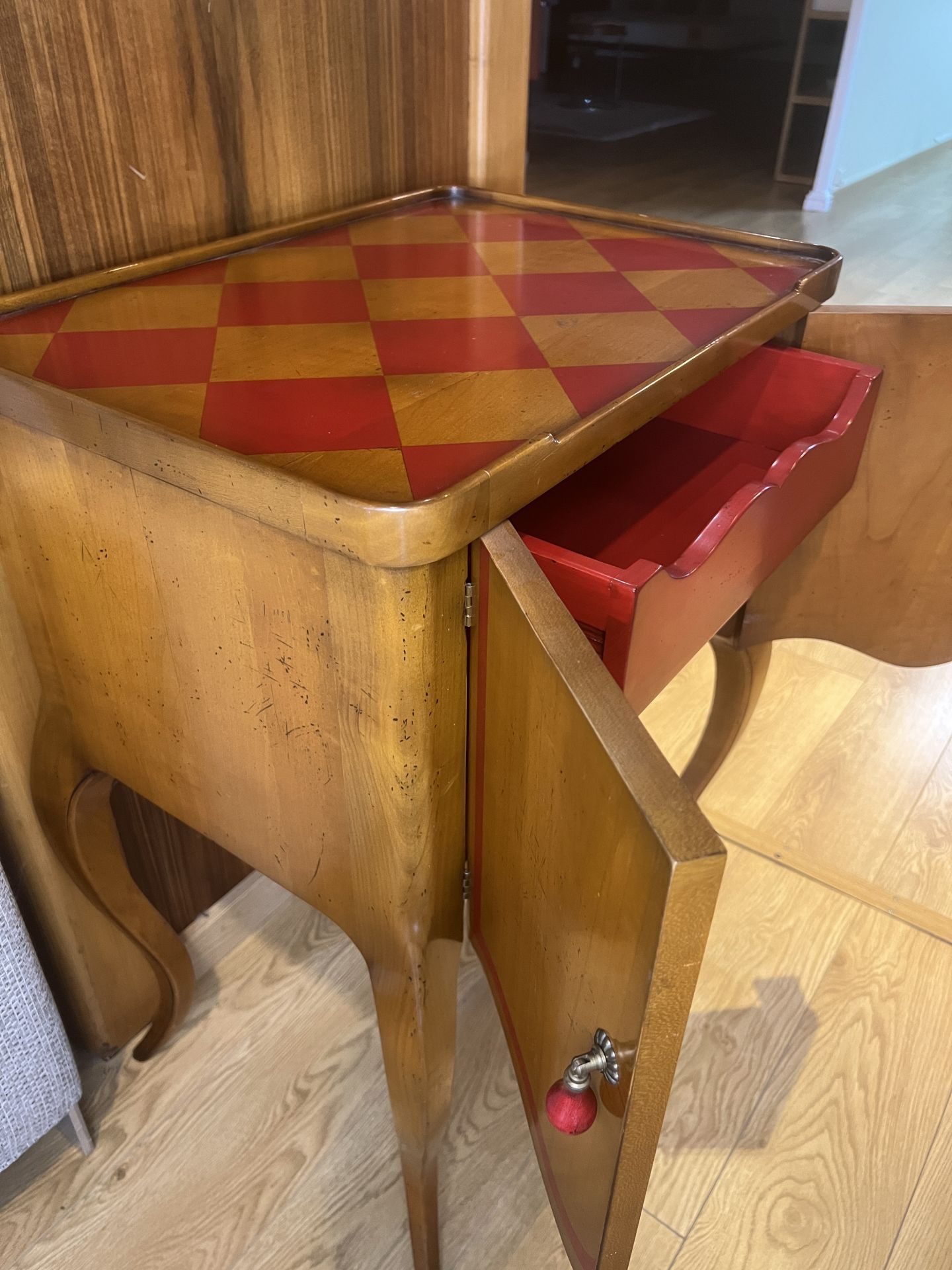 Mueble auxiliar en madera con puertas y cajon interior con tonos rojos y tapa en rombos rojos.