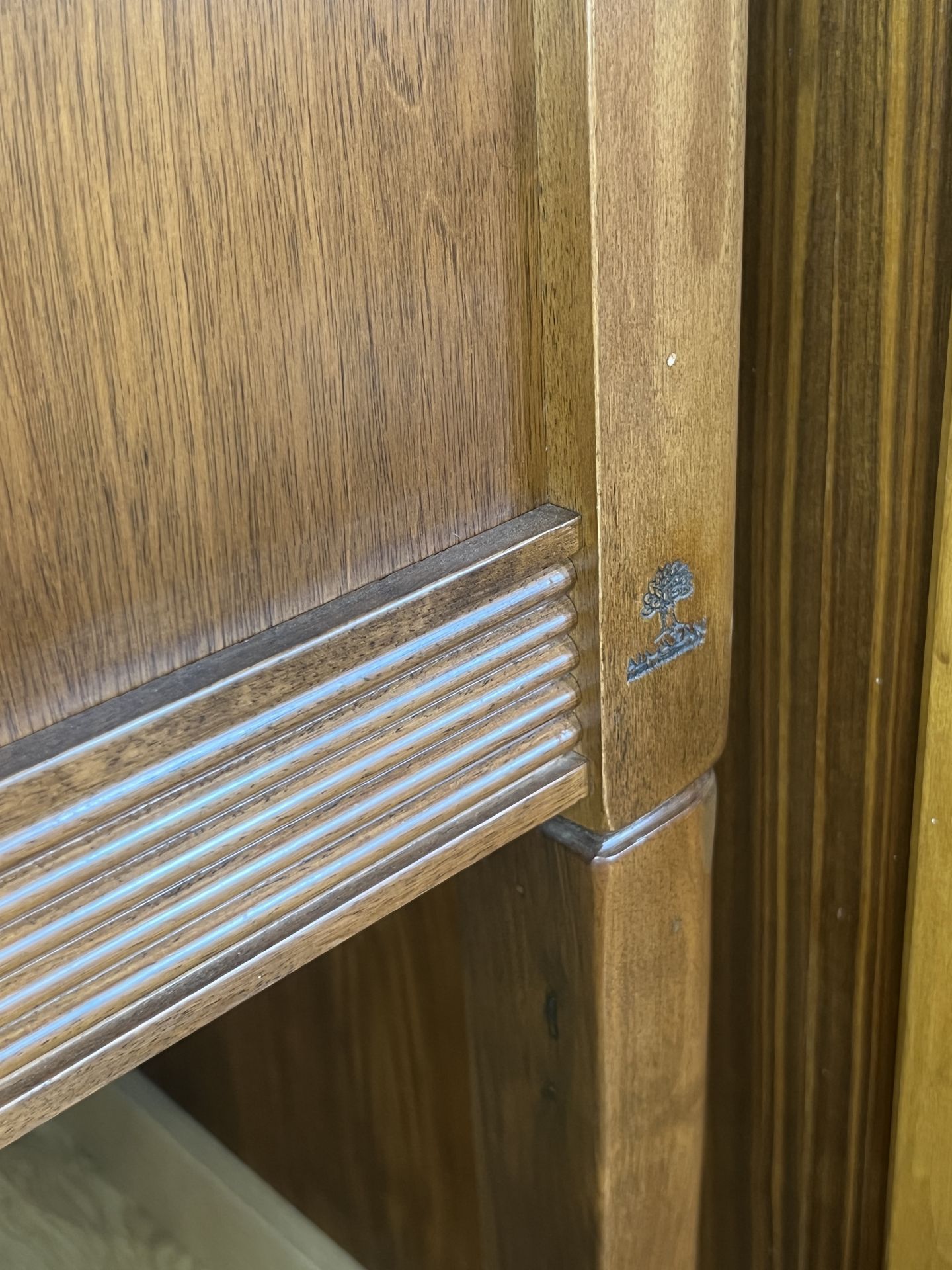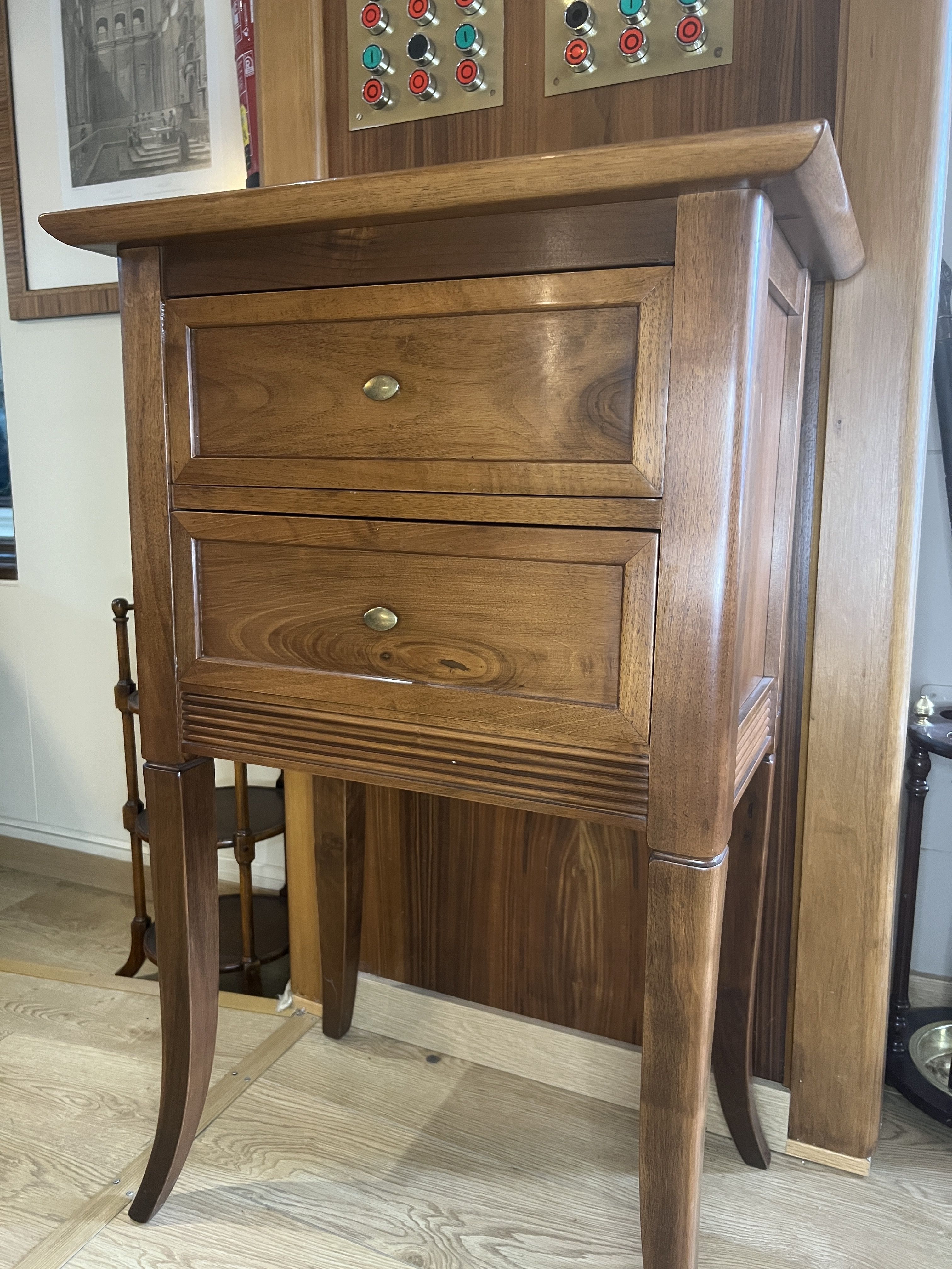 Mueble auxiliar telefonera en madera con dos cajones y tiradores en acero.