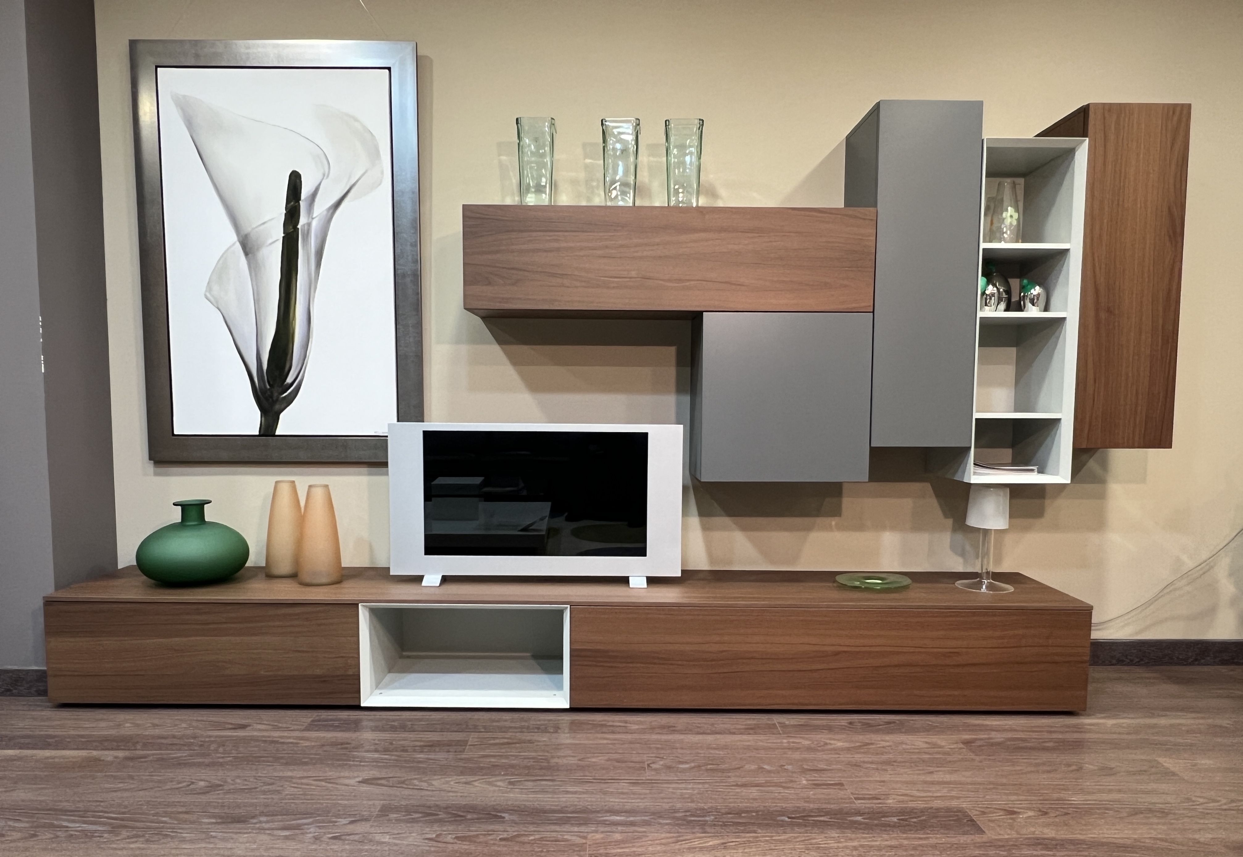Salón Spacio modular en acabado nogal y canaleto , laca roccia y piombo.