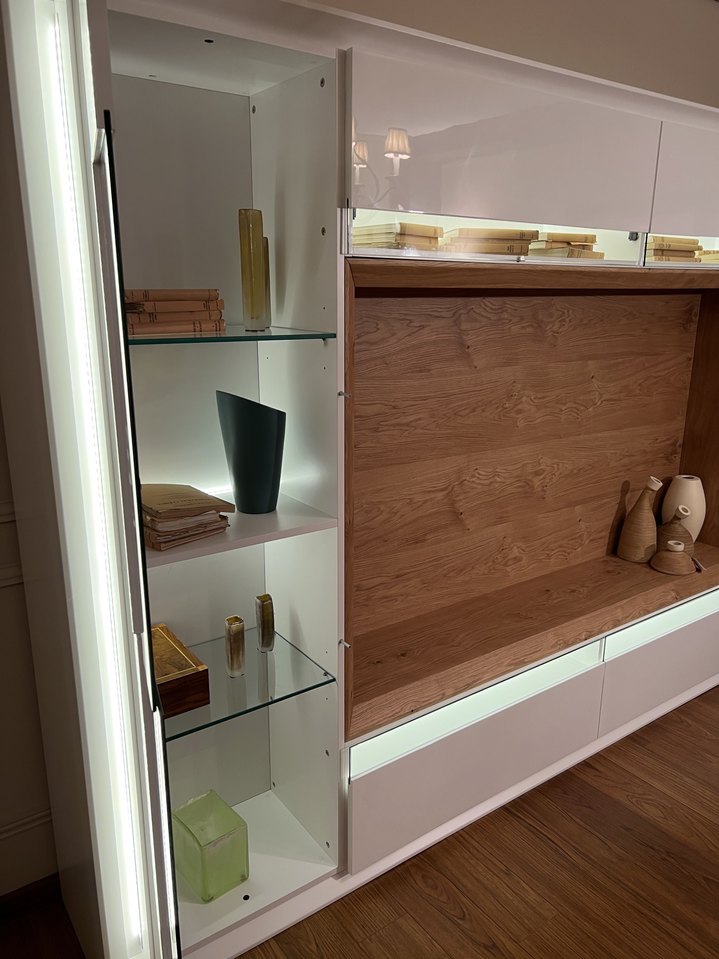 Mueble salon librería en acabado roble pipi y laca balnaco mate y brillo
