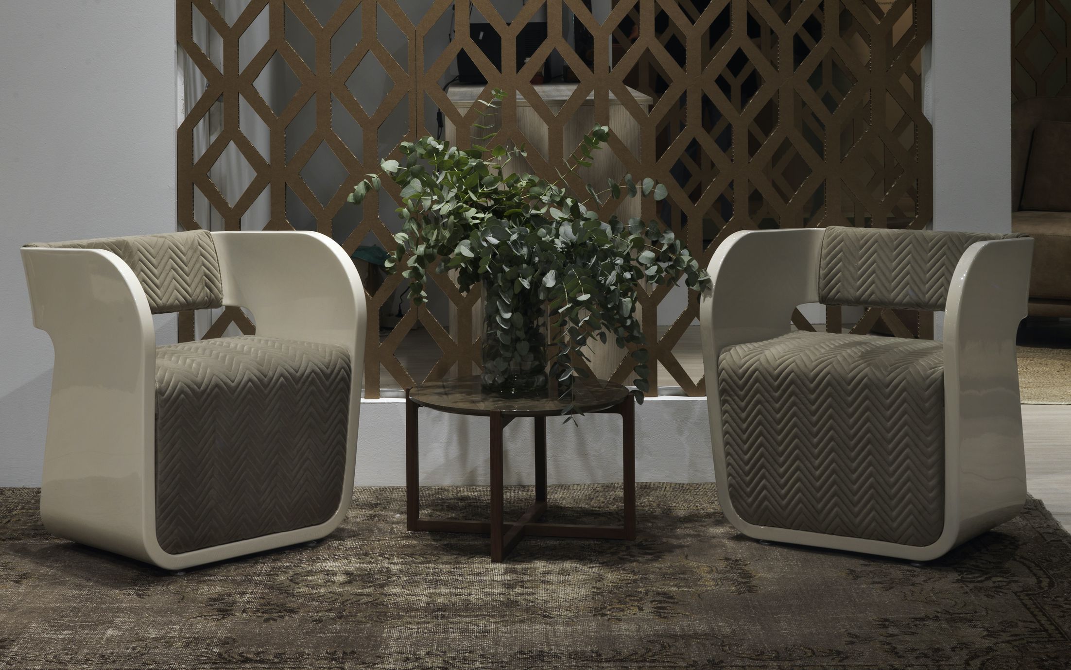 Estructura PVC lacado alto brillo en varios colores. Asiento tela o piel.