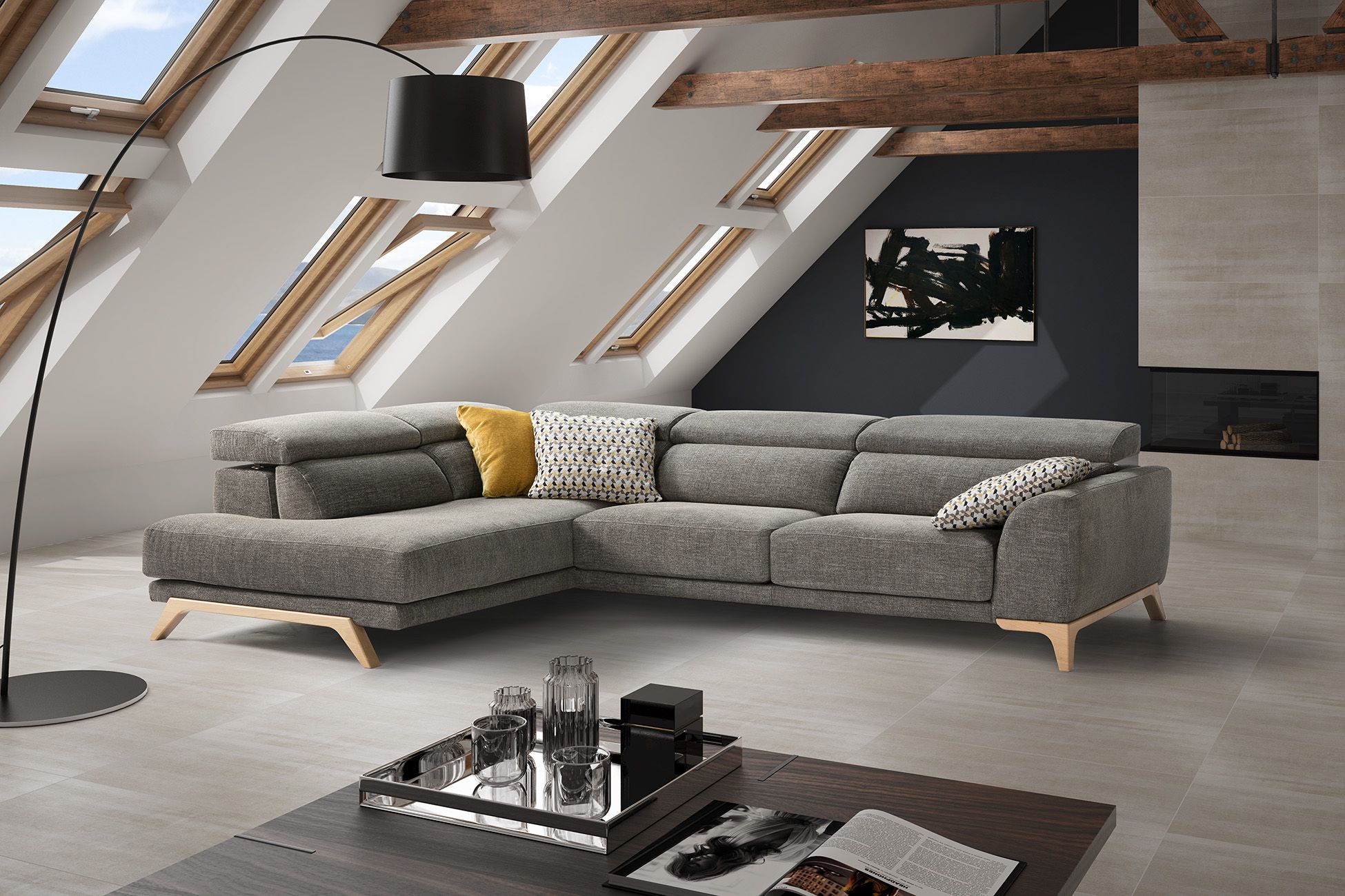 El estilo que no renuncia al confort. Un sofá acogedor de líneas contemporáneas, con asientos deslizantes y respaldo abatible.