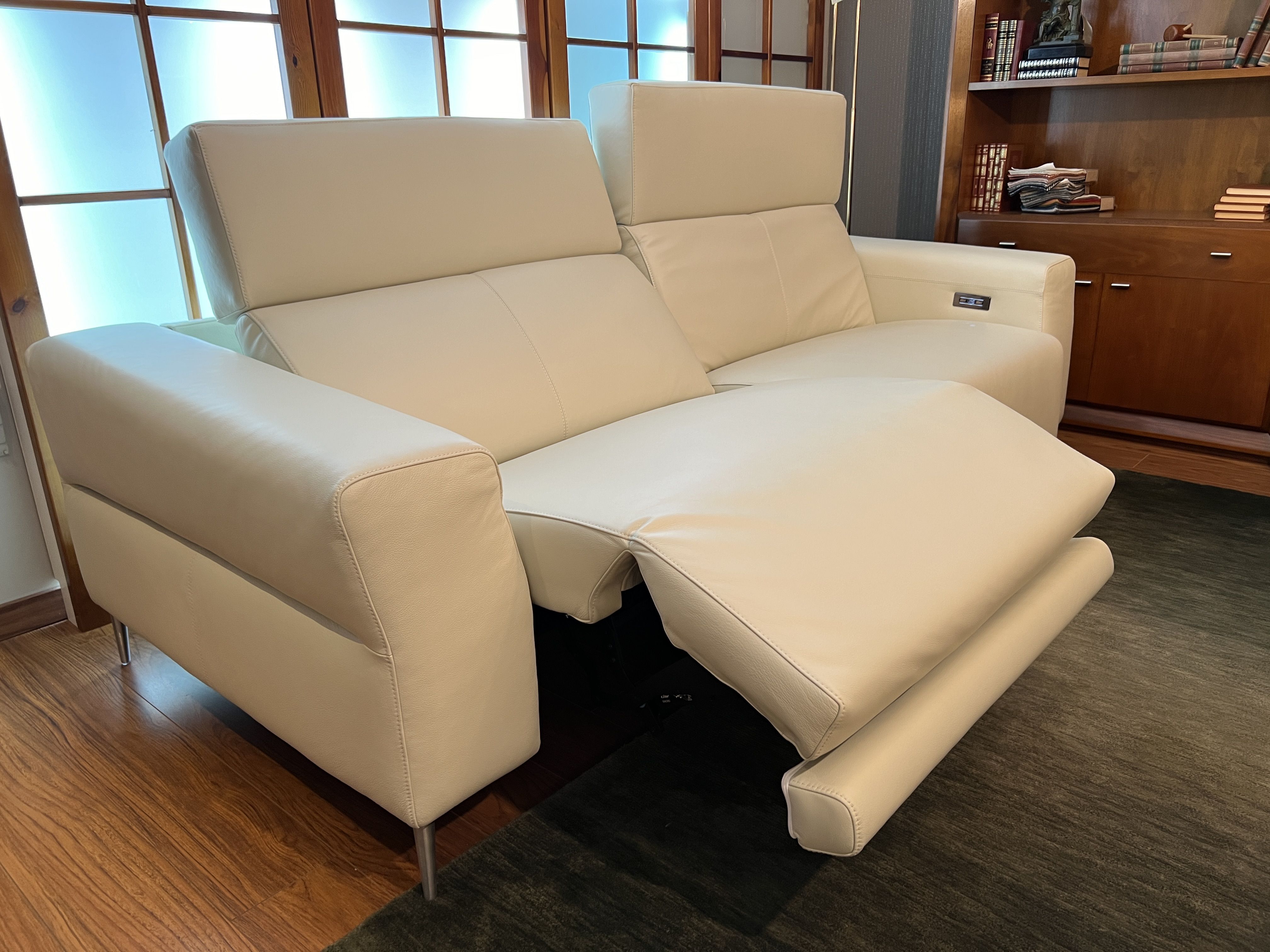 Sofá relax Goa con eléctrico dos motores derecho cabezal y cuerpo y un motor electrico izquierdo cabezal en piel tauro blanco y pata cromada. Altura con el cabezal bajado75 cm.