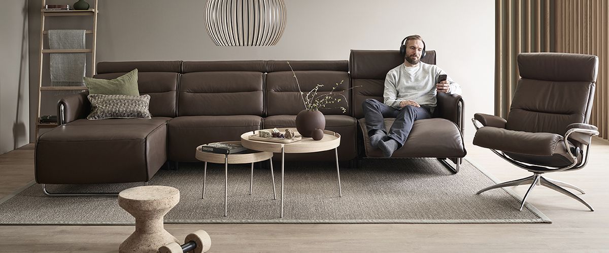 Las líneas elegantes y modernas aportan al Stressless Emily una imagen muy acogedora. Además, el diseño contemporáneo de sus suaves y cómodos cojines le invitan a sentarse y relajarse. Todos los módulos de asientos se presentan con reposacabezas ajustable. También están disponibles con respaldos fijos o bien, motorizados para que pueda ajustar el respaldo y el soporte para las piernas.